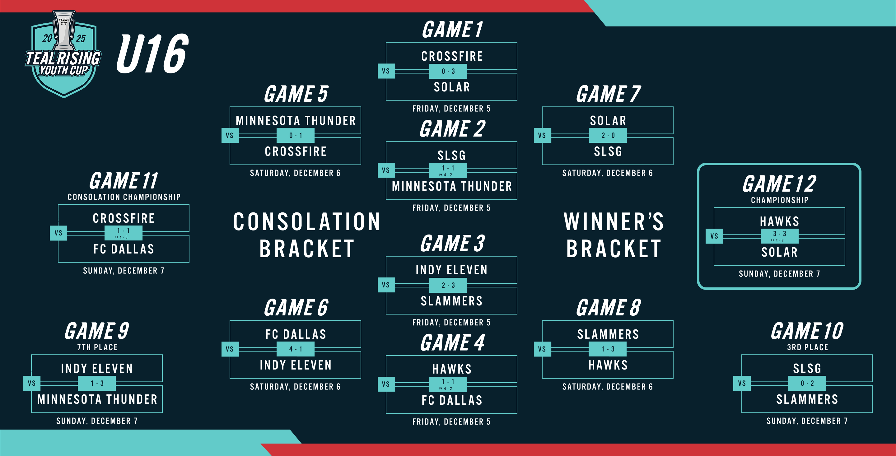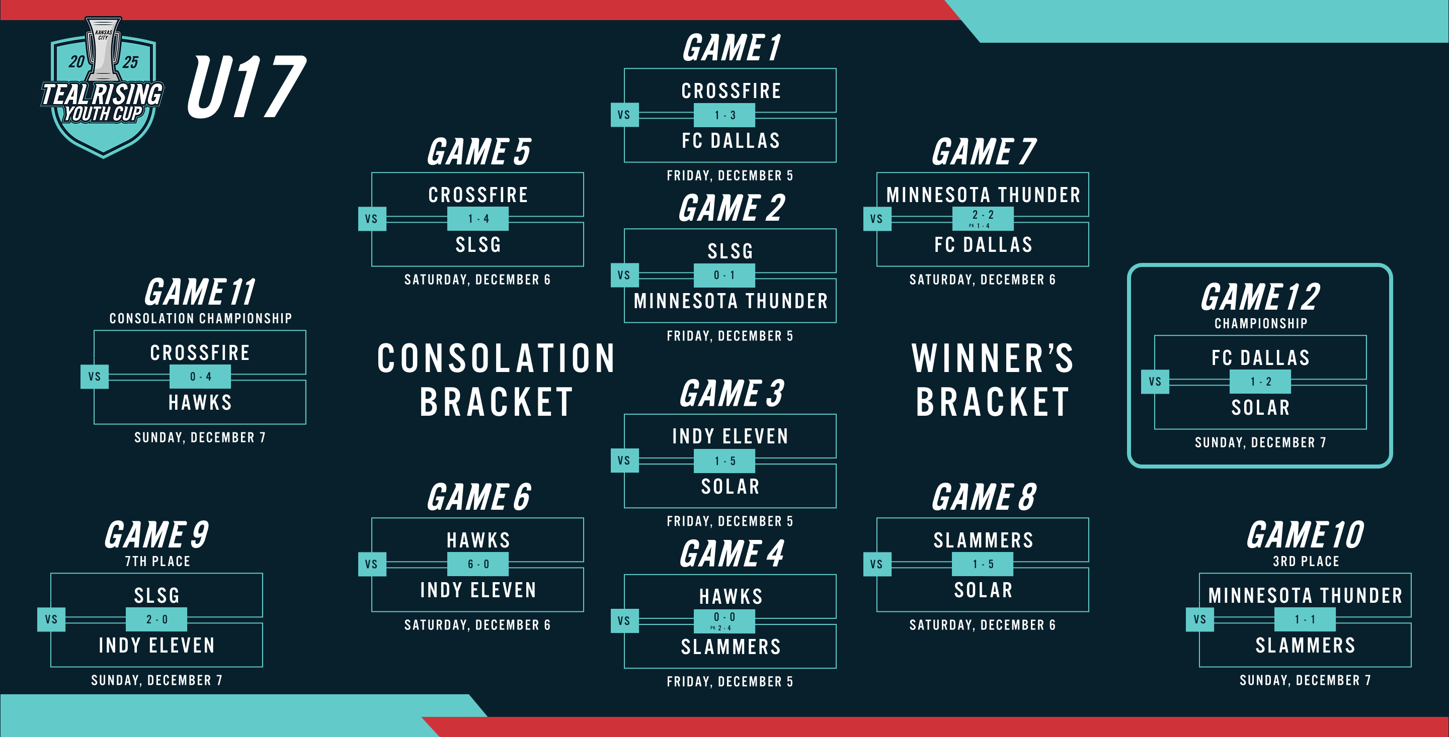 Consolation Bracket includes Game 5: (Final: 0-1) Minnesota Thunder vs. Crossfire on Saturday, December 6. Game 6: (Final: 4-1) FC Dallas vs. Indy Eleven on Saturday, December 6. Game 9: (Final: 1-3) Indy Eleven vs. Minnesota Thunder as a 7th place match on Sunday, December 7. Consolation Championship Game 11: (Final: 1-1 PK 4-5) Crossfire vs. FC Dallas.