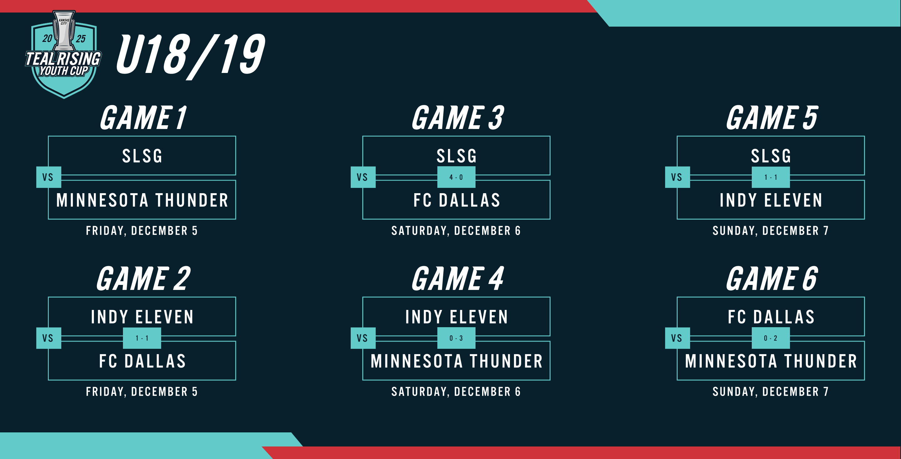 Game 1: SLSG vs Minnesota Thunder, Friday, December 5. Game 2: (Final: 1-1) Indy Eleven vs FC Dallas, Friday, December 5. Game 3: (Final: 4-0) SLSG vs FC Dallas, Saturday, December 6. Game 4: (Final: 0-3) Indy Eleven vs Minnesota Thunder, Saturday, December 6. Game 5: (Final: 1-1) SLSG vs Indy Eleven, Sunday, December 7. Game 6: (Final: 0-2) FC Dallas vs Minnesota Thunder, Sunday, December 7.